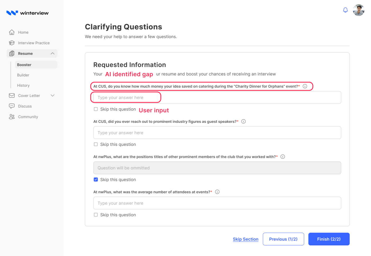 We added a section of clarifying questions to the resume booster. These acted as helpful prompts to gather missing or overlooked details.