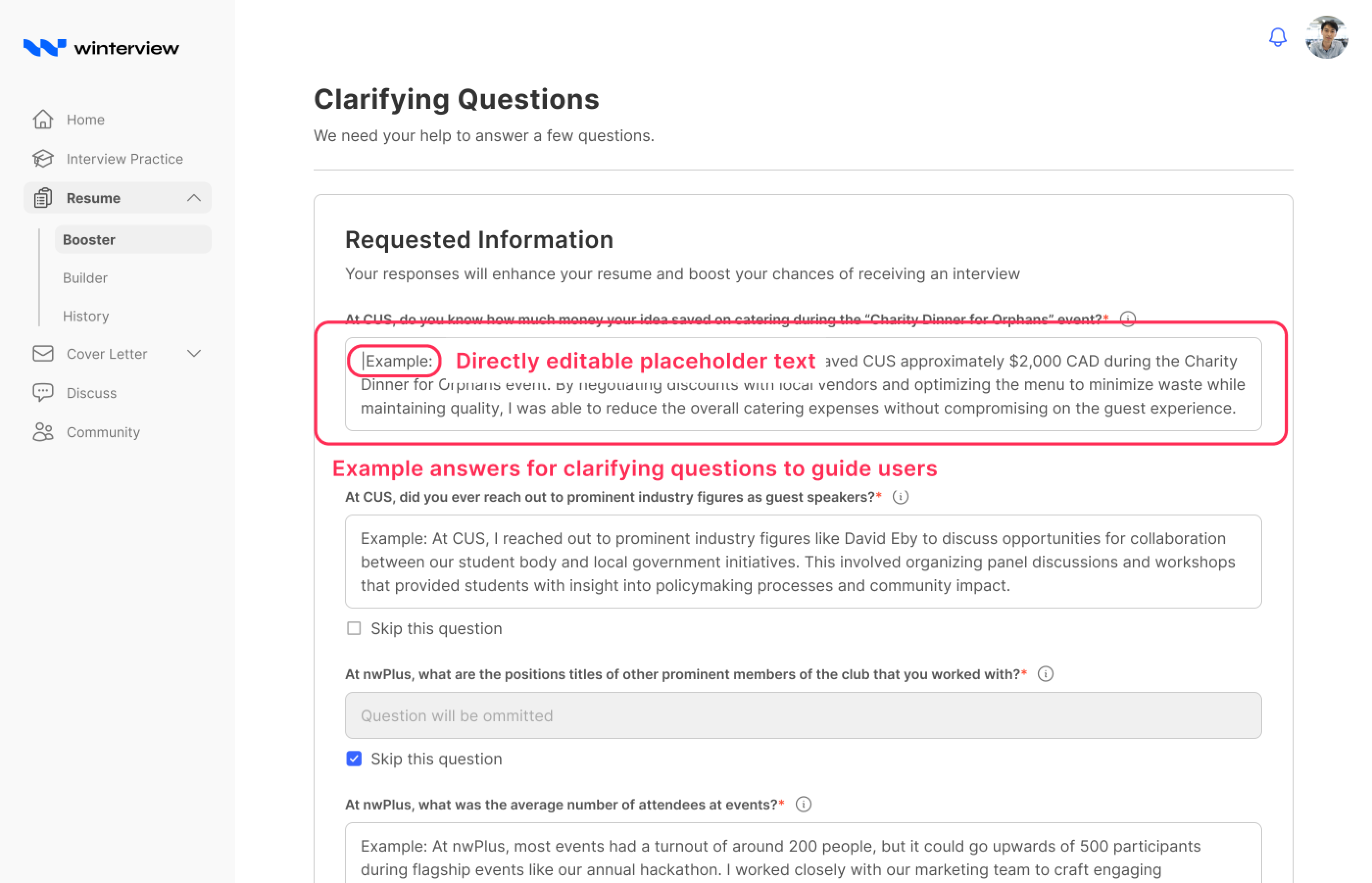 For high-volume users (3+ resumes/day), answering clarifying questions became tedious. We introduced editable placeholder examples so they could skip the blank-page moment and move faster.