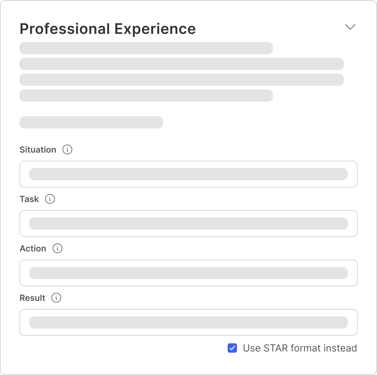 To improve resume quality, we guided users through the STAR framework: Situation, Task, Action, Result. This helped them write stronger, impact-driven stories with clear metrics.