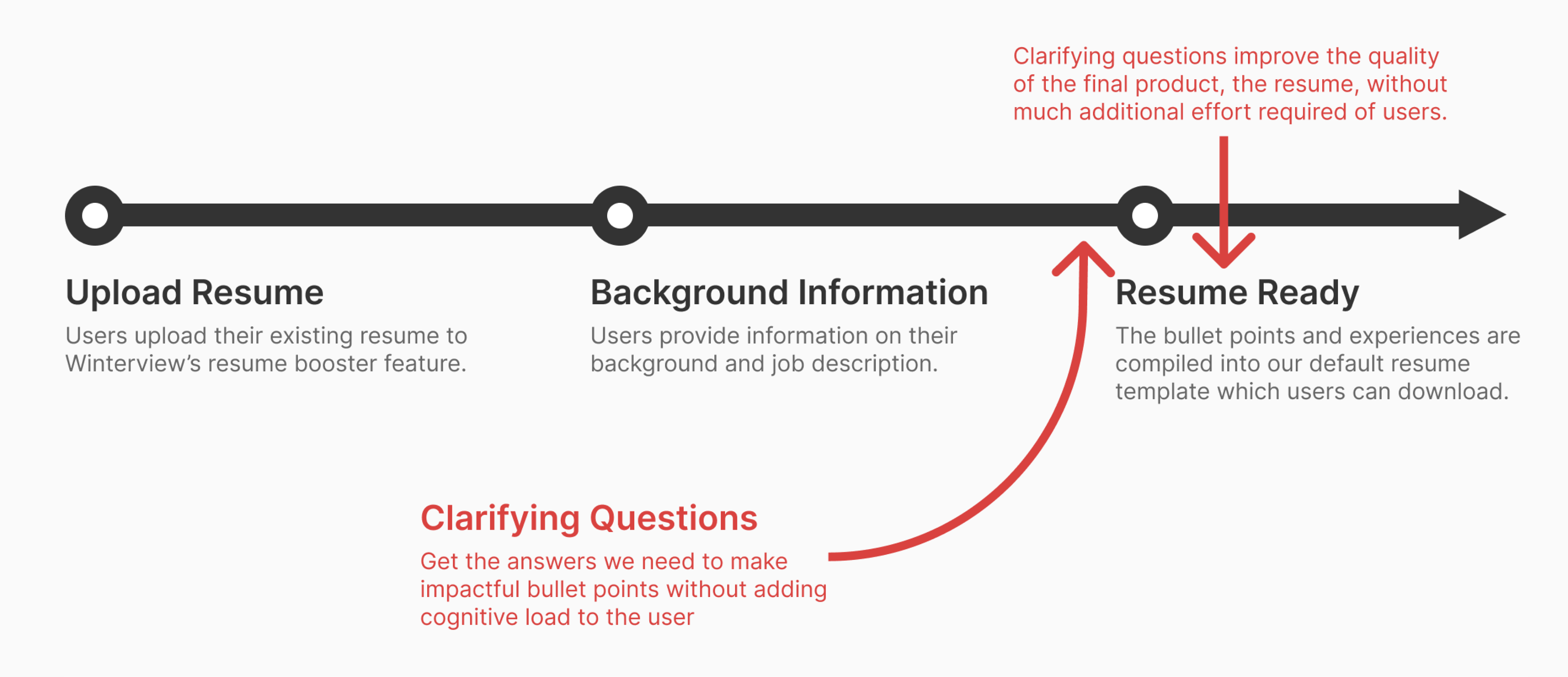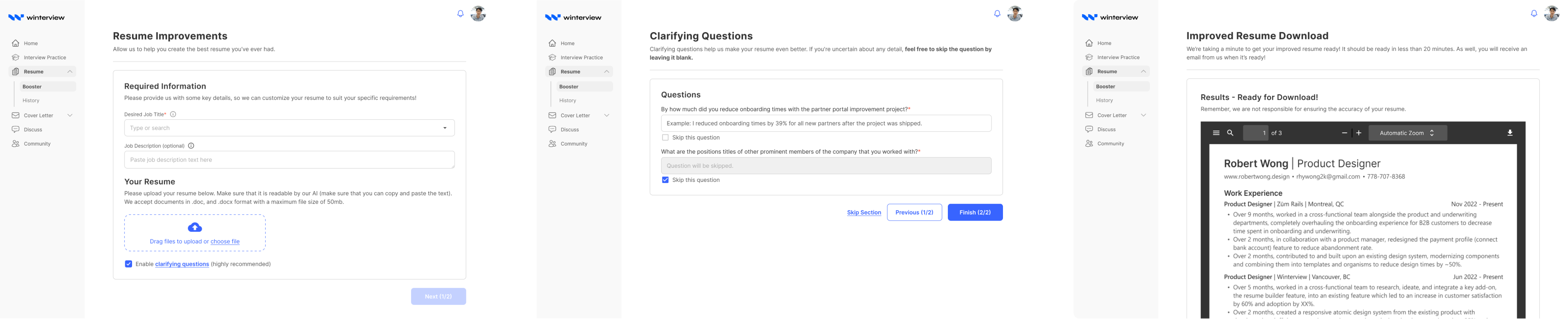 One of Winterview’s core features was the Resume Booster: a tool that matched applicants’ resumes to specific job descriptions. Adoption was limited, often due to resumes missing critical information—especially from users unfamiliar with what employers expect. By identifying this gap and reducing the consequences of missing content, we significantly increased usage of the feature.